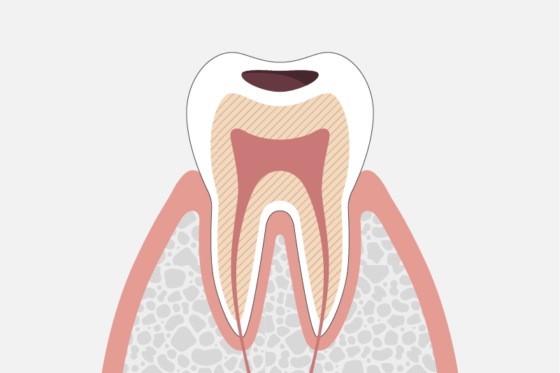 虫歯が象牙質まで進行し、冷たいもの・甘いものがしみるなどの症状が出始めます。